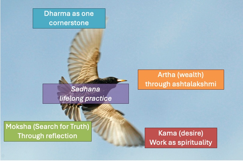 To build alternatives, assumptions must shift: individuals relate to systems, experience holistic well-being, pursue livelihood while nurturing Earth, with intergenerational responsibility and purpose defined by puruṣārtha framework (as defined in Yoga). That is, to redefine wealth (artha), find expression for one’s desire (kāma) and simultaneously be on the path of inner freedom (mukti / mokṣa); thereby becoming stewards (lens of dharma).